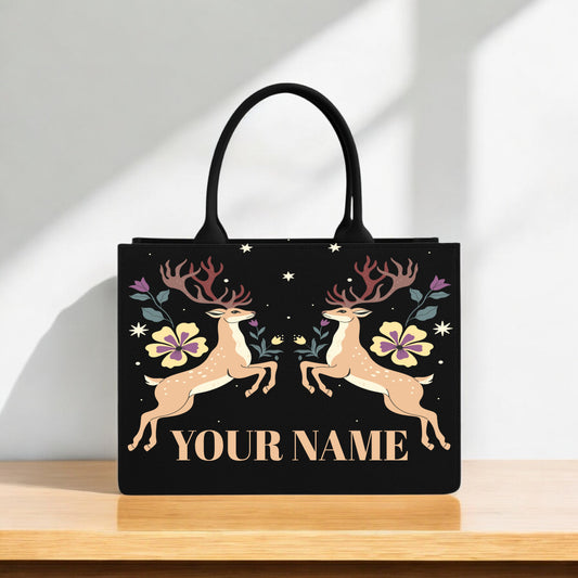 Premium Black Canvas Tote Bag Elegant Deer & Snowfall Design with Personalized Alphabet "A" Eco Friendly