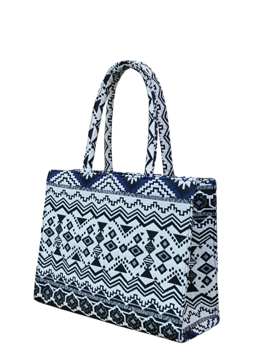 Ethnic Patterned Blue & White Jacquard Tote Bag – 11x14 Inch Elegant Everyday Handbag