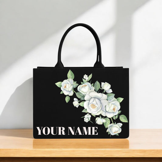 Floral Tote Bag for Women Elegant Black Canvas Handbag with White Roses Design & Custom Name
