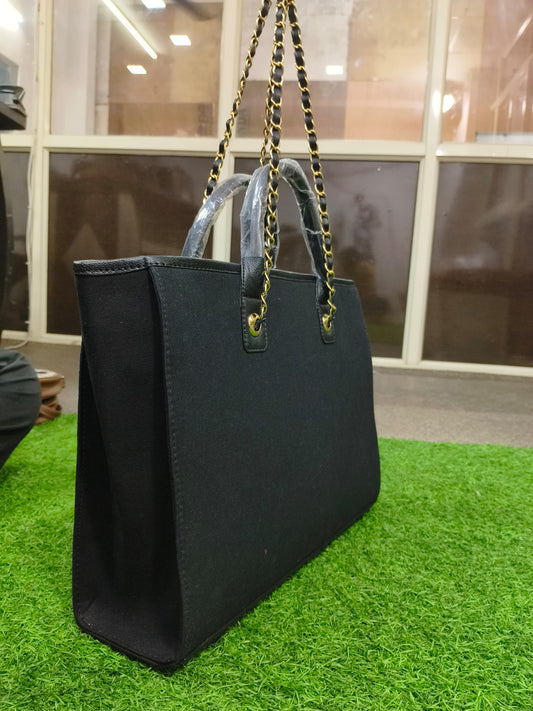 Sophisticated and spacious, this black tote features luxe gold chain handles and a sleek structured design perfect for modern professionals and everyday elegance.