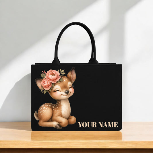Deer Print Designer Tote Bag 12x16 Inch Elegant Floral Cartoon Pattern with Custom Name Option Premium Black Handbag for Women & Girls