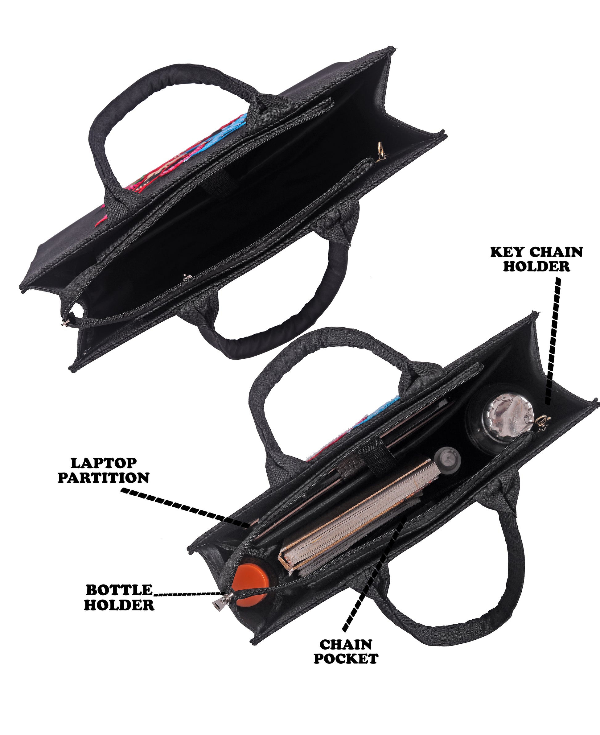 Enhance your accessory collection with this exquisite Khatli Work Tote Bag, a masterpiece of traditional craftsmanship and modern utility. Made with precision, this handcrafted tote features intricate Khatli embroidery, creating a luxurious and artistic appeal. The rich floral and geometric embroidery against a solid black base adds a touch of sophistication, making it a statement piece for any occasion. Designed for both style and practicality, this bag is spacious, lightweight, and eco-friendly, making it a must-have for fashion-forward women.